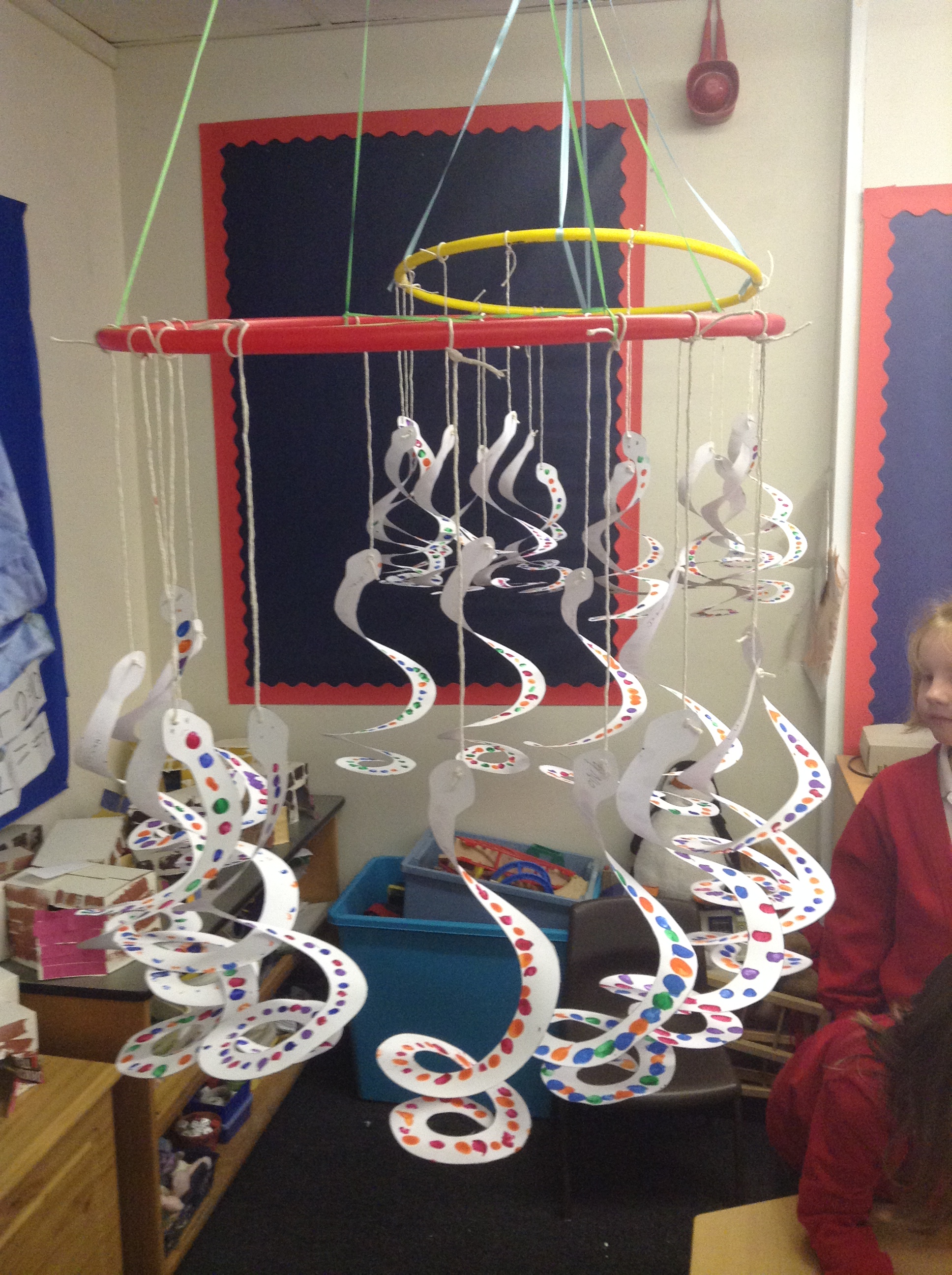 This morning we have been making repeated patterns on a snake. In Asia, it was the year of the snake in 2013. We were using 2, 3 and sometimes even 4 colours in our pattern.